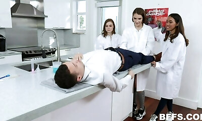 Three lab assistants gargle one dinky and enjoys reverse ganbang for the first time