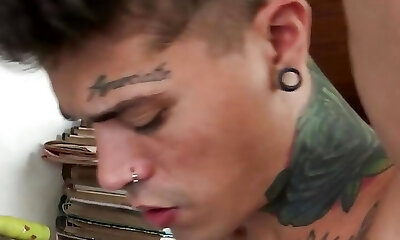 Sully Savage gets a tattoo on her sphincter then sucks two dicks